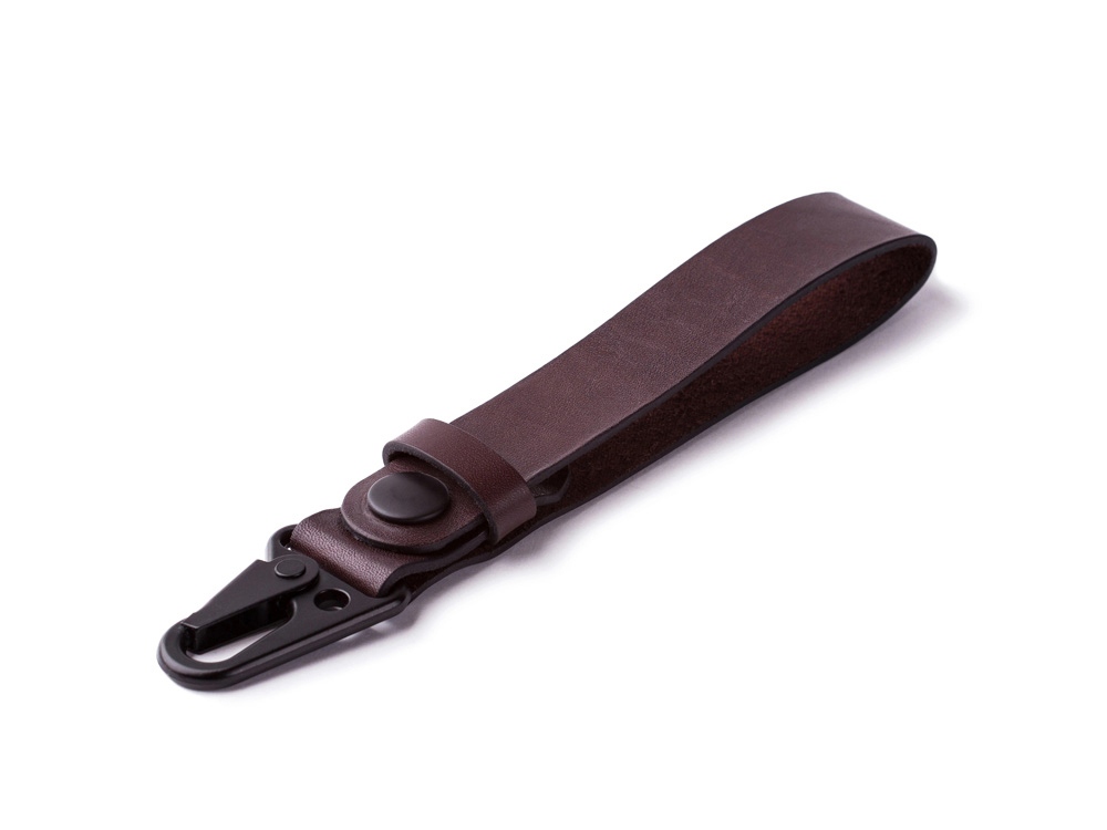 Ремешок сшит из прочной кожи коричневого цвета. Оборудован надёжным металлическим карабином, самопроизвольное расцепление которого невозможно. Ключи, прицепленные к нему, обречены вечно храниться в глубинах сумки или кармана джинсов, и у них нет ни единого шанса потеряться. Прицепить ремешок можно к шлёвке джинсов или к куртке. Тиснение (Блинт) на данный товар осуществляется бесплатно. Оплачивается только настройка оборудования в размере 8700 рублей на весь тираж.