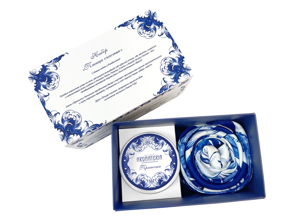 Подобно морозному узору на окне, раскинулся волшебный сад чудесной птицы, где завитки, соцветия и кобальтовые розы созданы в технике Гжель. Платок Гжель и дивная птица счастья – для незабываемых мгновений торжества и блистательного образа! Свеча Пряности дополнит праздничный декор и окутает пространство вуалью притягательного и чуть терпкого аромата, сотканного из нот черного перца, амбры, нероли. Дуэт Птица счастья непременно принесет Вам исполнение желаний в Новом Году! Платок: 70% искусственный шёлк, 30% вискоза, 90х 90 см Свеча: натуральный соевый воск, парфюмерная композиция (объем 100мл/ 20 часов горения)