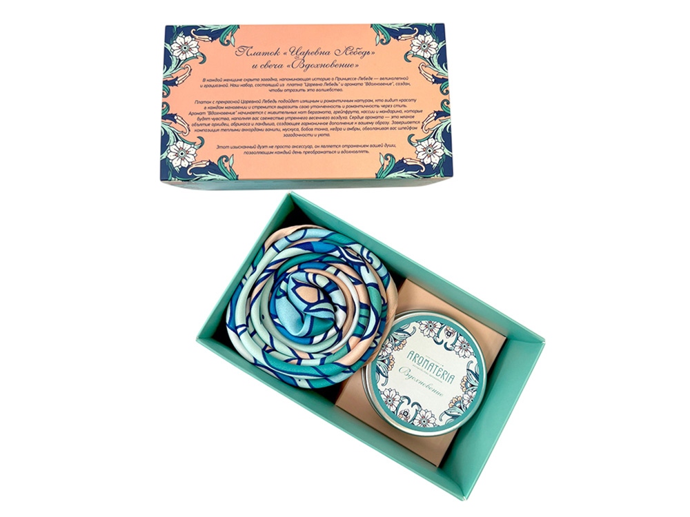 Комплект посвящен всем женщинам-музам, окрыляющим на свершения и открытия. Платок Царевна Лебедь создан по мотивам сказочно-фольклорного мира А.С. Пушкина, где прекрасная Царевна воплощает добродетель, мудрость и чарующую красоту. Перевоплощаясь в птицу, она способна достичь небывалых высот и озарить мир своим великолепием. Аромат свечи Вдохновение соткан из свежих нот цитрусовых и бергамота, пряных аккордов кассии и многоцветия орхидеи, ландыша, ванили. Дуэт станет эффектным акцентом праздничной атмосферы и непременно принесет воодушевляющие мгновения своей обладательнице!