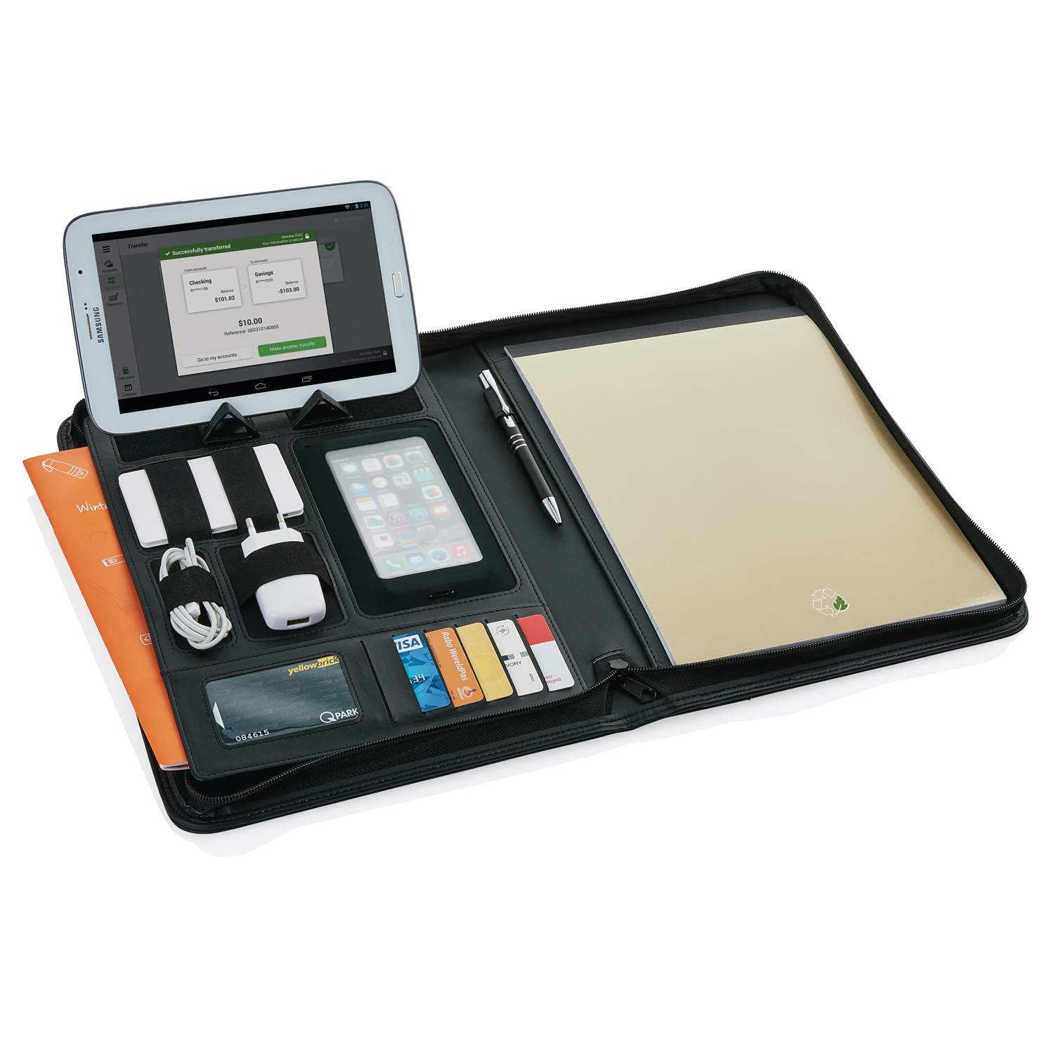 Папка для документов Essential на молнии формата A4. Внутри папки: подставка для планшета / телефона, держатель для телефона с прозрачным окном, которое позволяет работать с сенсорным экраном. Подходит для наиболее распространенных телефонов для iPhone 6, Samsung S6. Кроме того есть отделения для гаджетов, например, флешки, USB-кабеля и зарядного устройства. А также отделения для пластиковых карт и большое отделение для документов или планшета. В комплекте блокнот для записей формата A4 на 20 листов. Подходит для всех планшетов iPad, Android и Microsoft Windows.