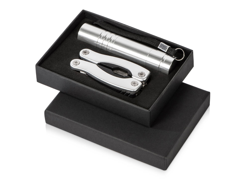 Подарочный набор Scout с многофункциональным ножом и фонариком. 11-тифункциональный инструмент с диодным фонариком упакован в черную картонную коробку. Батарейка в комплекте. Алюминий. Гравировка (оптоволоконный лазер) (Без чернения) на данный товар осуществляется бесплатно. Оплачивается только настройка оборудования в размере 1100 рублей на весь тираж.