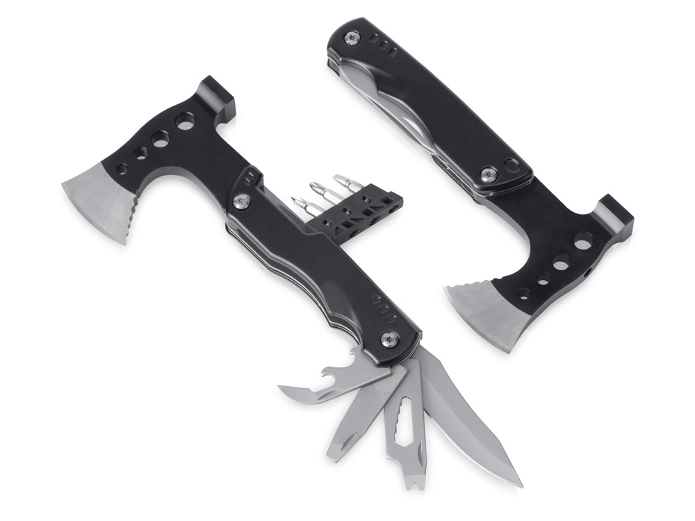 Топор-мультитул 7-в-1 Stalk бренда roq выполнен из нержавеющей стали 420 марки. Обладает значительным весом в 404 грамма для удобства работы топором или молотком. Товар поставляется в брендированном нейлоновом чехле с защитной накладкой на острие топора, что делает его транспортировку абсолютно безопасной. 1.Топор 2.Молоток 3.Сет отверток (плоская отвертка 5 мм, 2 крестообразные отвертки) 4.Нож 5.Шестигранник на 5 размеров (4/5/6/7/8 мм) 6.Напильники по металлу и дереву, плоская отвертка 7.Консервный нож и открывашка для бутылок Гравировка (оптоволоконный лазер) (Без чернения) на данный товар осуществляется бесплатно. Оплачивается только настройка оборудования в размере 2700 рублей на весь тираж.
