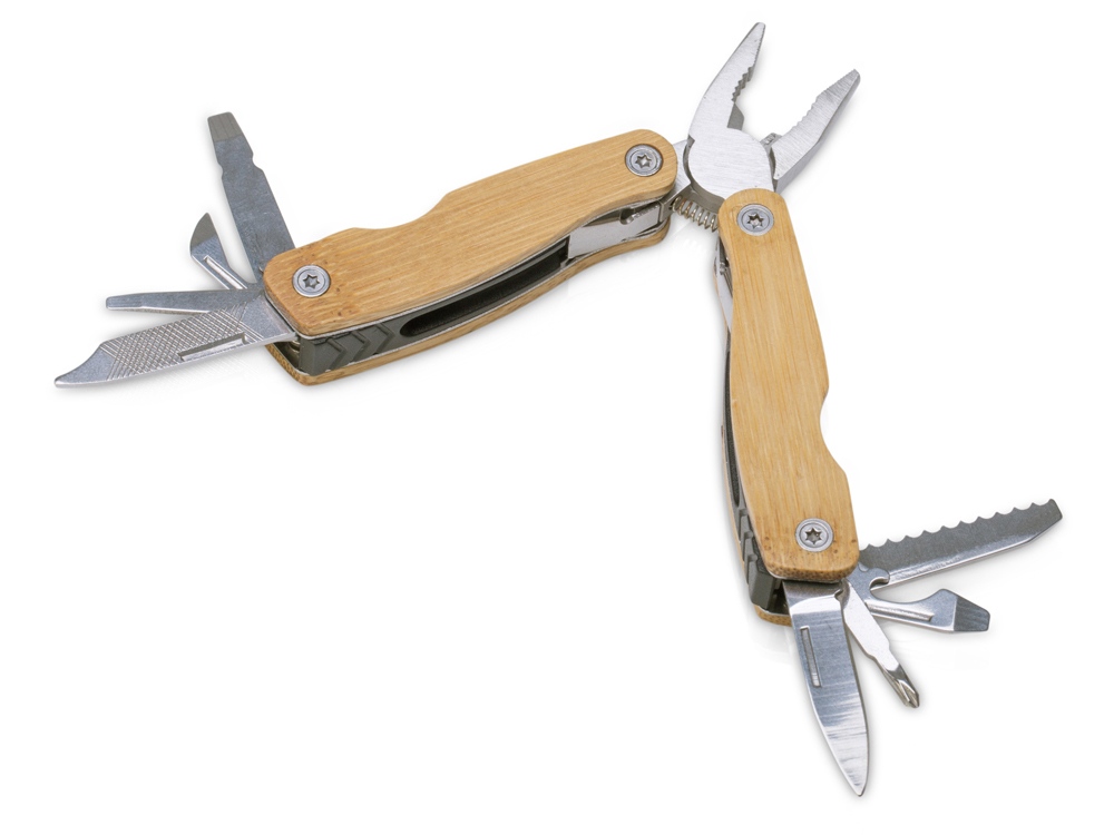 Компактный мультитул на каждый день с корпусом из бамбука. Поставляется в коробочке с чехлом. - плоскогубцы - открывалка для бутылок - крестовая отвертка - нож универсальный - открывалка для банок - плоская отвертка 3 шт. - пила по дереву - напильники по дереву и металлу Гравировка (CO2 лазер) (Без чернения) на данный товар осуществляется бесплатно. Оплачивается только настройка оборудования в размере 2700 рублей на весь тираж.