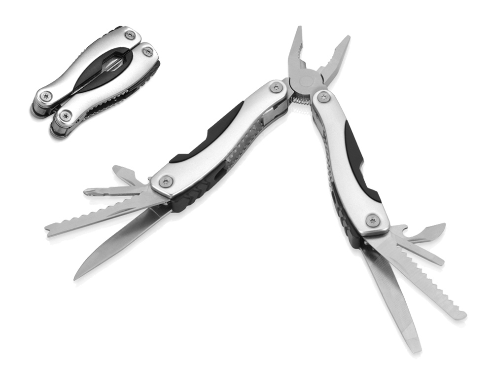 Настоящая находка для всех хозяйственных мужчин. Мультиинструмент всегда будет под рукой, так как его можно носить на поясе. Супер-пассатижи в чехле не так просты, как кажутся на первый взгляд! Они скрывают в себе целый арсенал нужных инструментов! - плоскогубцы - открывалка для бутылок - крестовая отвертка - нож-серрейтор для рыбы - нож универсальный - открывалка для банок - плоская отвертка 2 шт - пила - напильник Гравировка (оптоволоконный лазер) (Без чернения) на данный товар осуществляется бесплатно. Оплачивается только настройка оборудования в размере 2700 рублей на весь тираж.