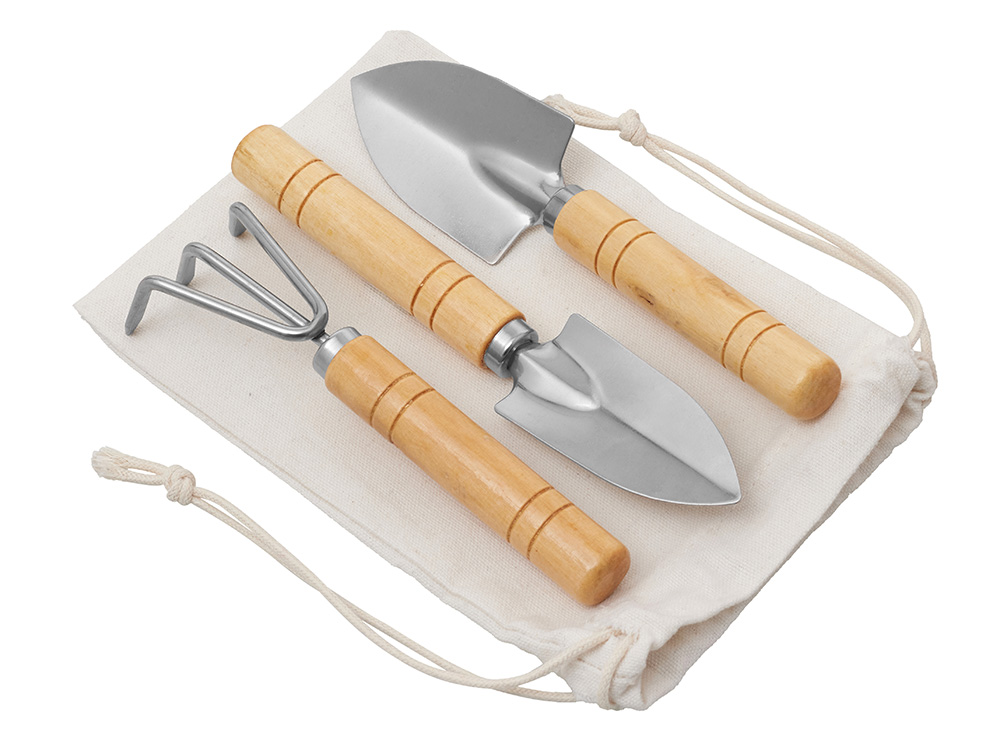 Садовый набор из 3 аксессуаров из нержавеющей стали и бамбуковая ручка. Включает большую и малую лопатки и грабли. В комплект входит хлопковый мешочек.