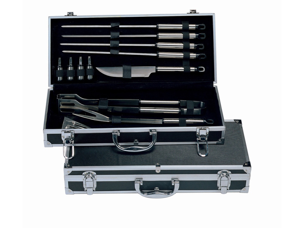 Набор для барбекю 12 предметов. 4 шампура, 4 шпажки для снятия шашлыка, нож, щипцы, вилка, лопатка. Шильд в комплекте 4,8 х 8,3 см. Гравировка (оптоволоконный лазер) (Без чернения) на данный товар осуществляется бесплатно. Оплачивается только настройка оборудования в размере 1100 рублей на весь тираж.
