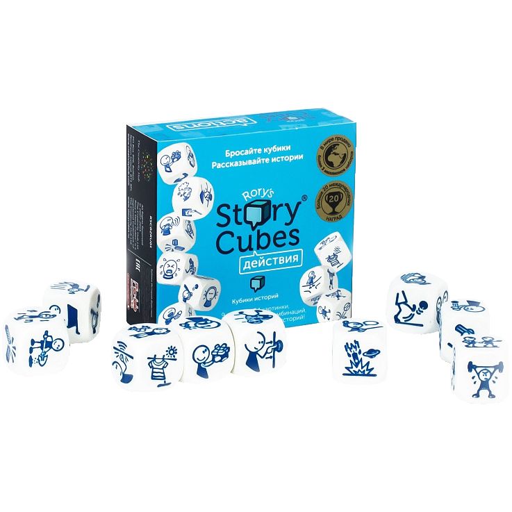 Вы можете легко объединять кубики из разных комплектов, чтобы придумывать еще более интересные истории.«Кубики историй. Действия» — версия, где акцент сделан на виды деятельности. Наиболее простой вариант для начинающих рассказчиков, так как почти каждая из 54 картинок на кубиках этого набора — это практически готовая история сама по себе.