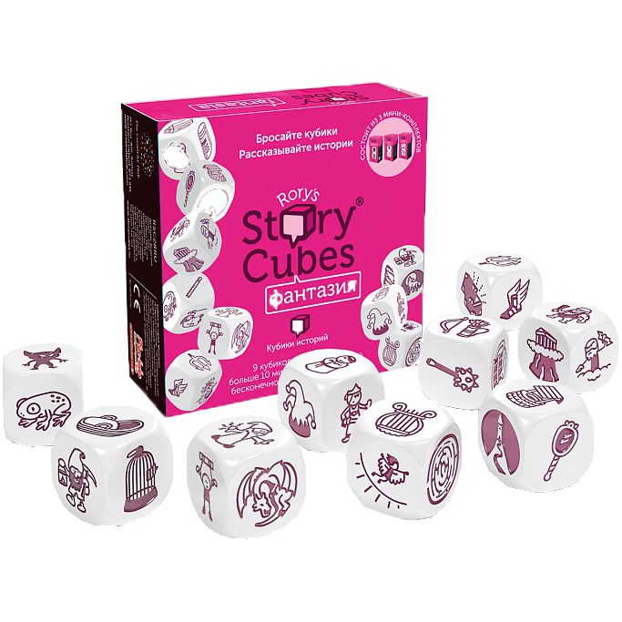 «Кубики историй. Фантазия» — версия, которая позволит придумать удивительную историю в жанре фэнтези. Кубики разбиты на три тематические группы — выбирайте, что вам ближе: сказки, мифы или средневековые легенды, а то и миксуйте все разом, чтобы сделать свой рассказ еще интереснее.