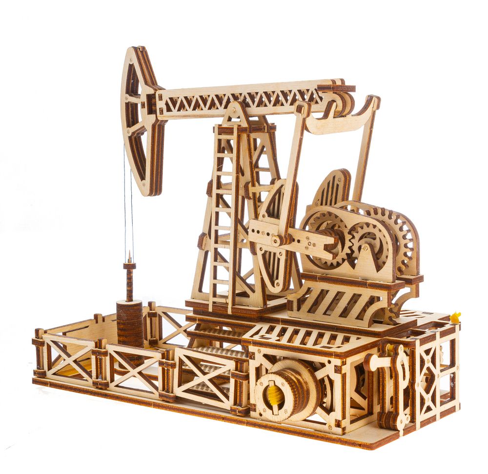 Трехмерный механический конструктор, сделанный из экологически чистого материала. Модель собирается без клея и приводится в действие с помощью шестеренок и простых канцелярских резинок. После запуска вышка «качает нефть» около двух минут.