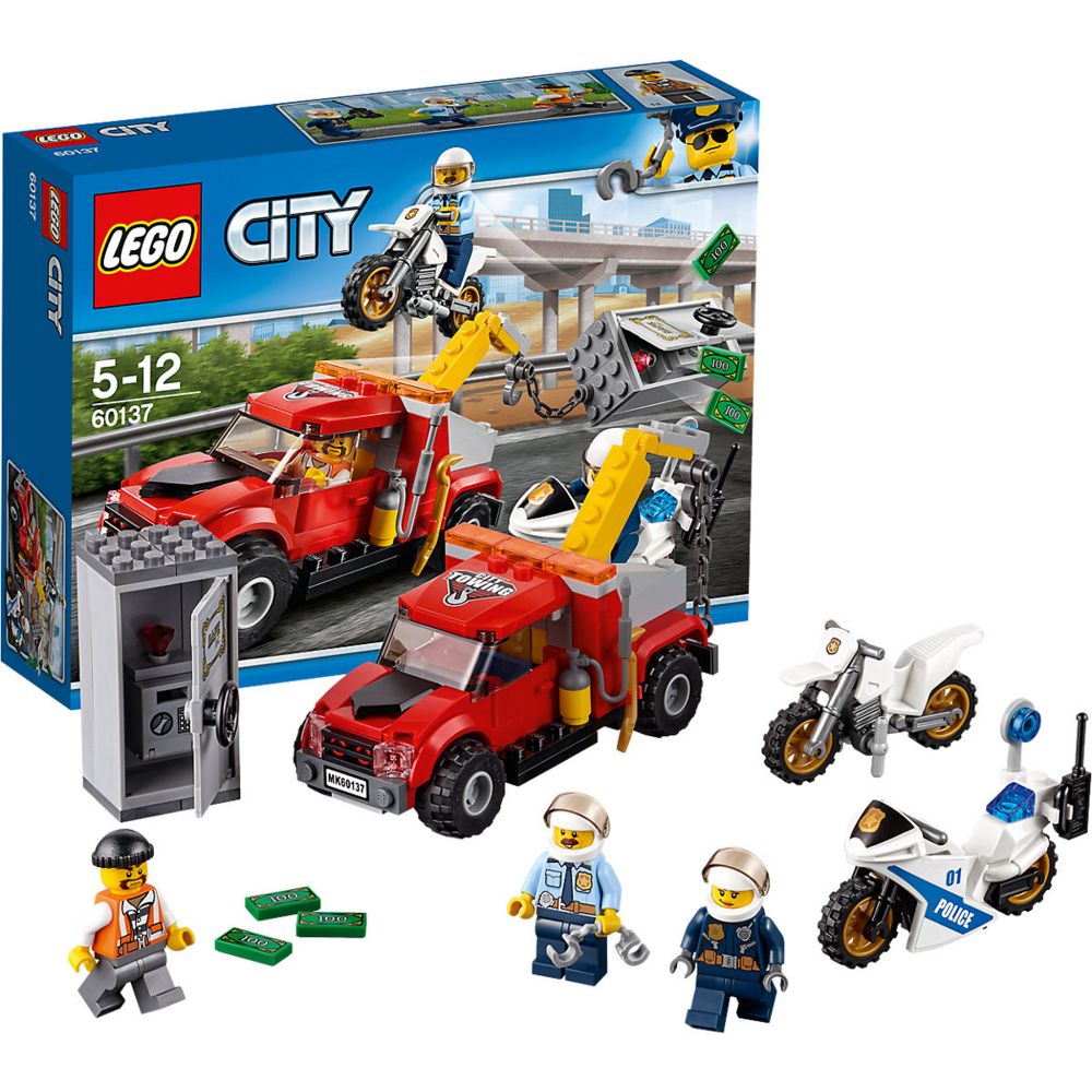 Конструктор «LEGO City. Побег на буксировщике» отлично подойдет к другим наборам с полицейскими для создания увлекательной игры, но может использоваться и самостоятельно. В комплект входят два мотоцикла и автомобиль-буксировщик. Дополняют набор сейф с деньгами, два полицейских и вор, а также необходимые для задержания аксессуары.