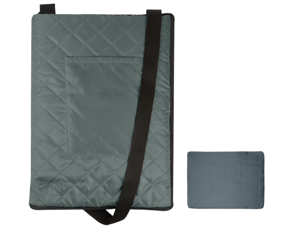 Двухсторонний плед с водоотталкивающим покрытием с одной стороны и мягким флисом с другой. Складывается в сумку на плечо и фиксируется с помощью молнии. В собранном виде имеет регулируемый по длине ремень для переноски и наружный карман для мелочей.