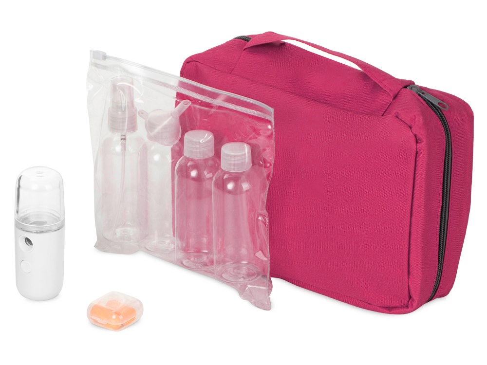 Практичный, легкий и компактный набор для путешествий. Аккуратный несессер можно взять в салон самолёта как ручную кладь, поэтому всё необходимое будет всегда под рукой, например, беруши, которые входят в состав сета. Флакончики объёмом 80 мл подойдут для шампуня, геля для душа и других косметических средств, один флакон оснащён распылителем. Бутылочки упакованы в прозрачный непромокаемый пакет на zip-lock застёжке, который дополнительно защищает багаж. Портативный увлажнитель для лица быстро освежит кожу и поможет сохранять ее увлажненной даже в долгих перелетах. - несессер подходит для ручной клади; - увлажнитель заряжается через usb провод (в комплекте); - всё, что нужно для путешествия на поезде или в самолёте; - время работы увлажнителя от внутреннего аккумулятора — до 3 часов. Термотрансфер (1 цвет (цветные изделия)) на данный товар осуществляется бесплатно. Оплачивается только настройка оборудования в размере 10000 рублей на весь тираж.