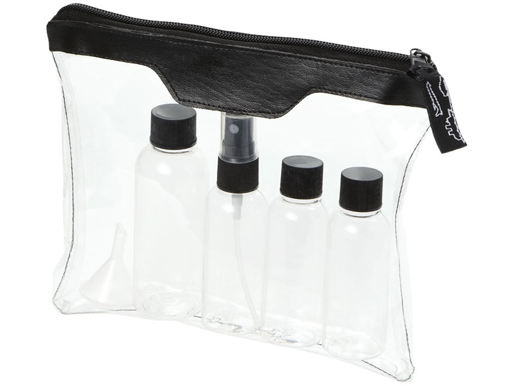 Одобренный дорожный набор бутылок для полетов Munich. Включает 2 бутылки по 50 мл, 1 бутылку на 90 мл и 1 пульверизатор. ПВХ. Тампопечать (1 цвет (цветные изделия)) на данный товар осуществляется бесплатно. Оплачивается только настройка оборудования в размере 4500 рублей на весь тираж.