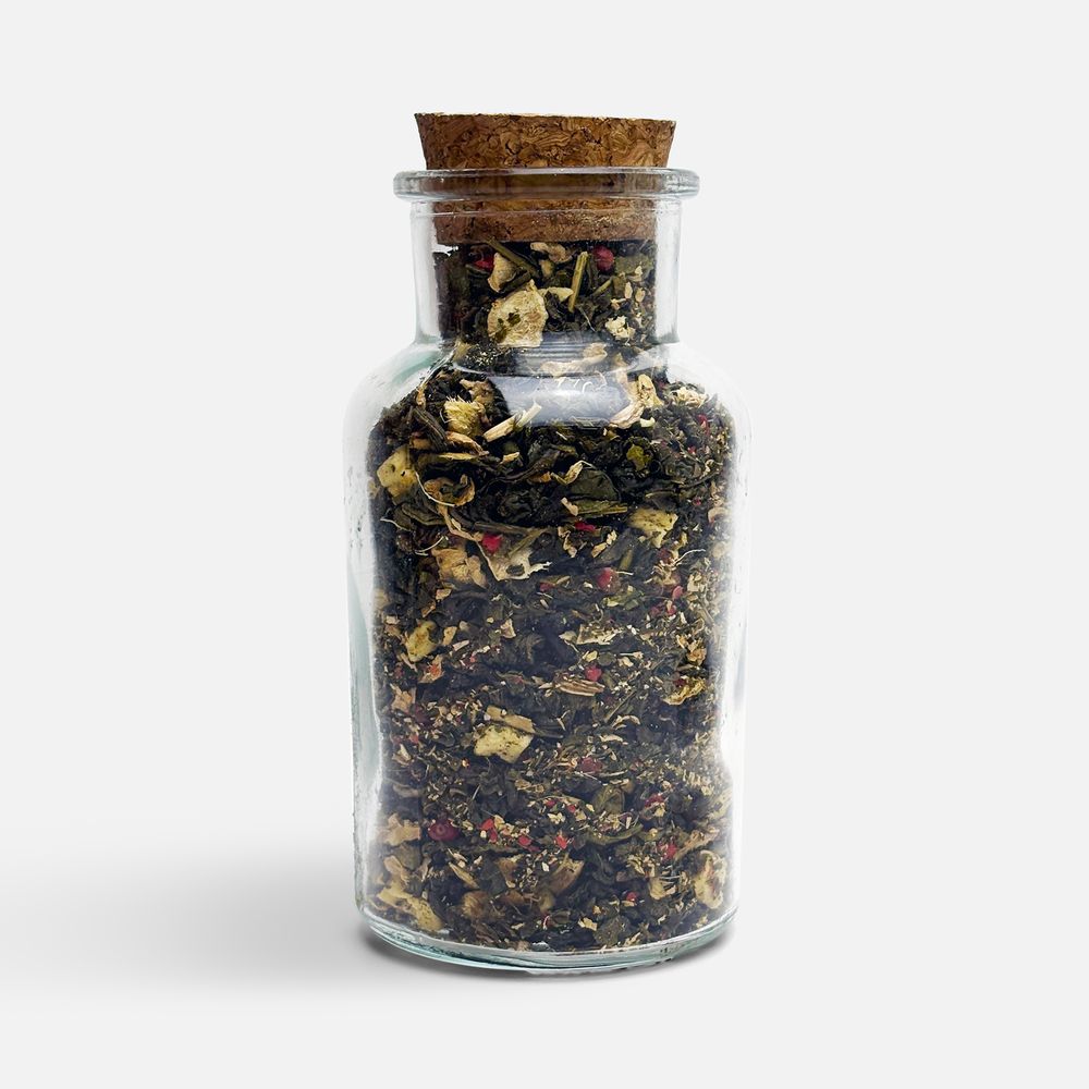 Зеленый крупнолистовой чай с кусочками имбиря, яблоком, гвоздикой и розовым перцем обладает многогранной палитрой вкуса и аромата. В состав чая входят только натуральные ингредиенты, а чайные листья предварительно вымачиваются в имбирном соке: вкус напитка становится особо насыщенным и обогащенным.