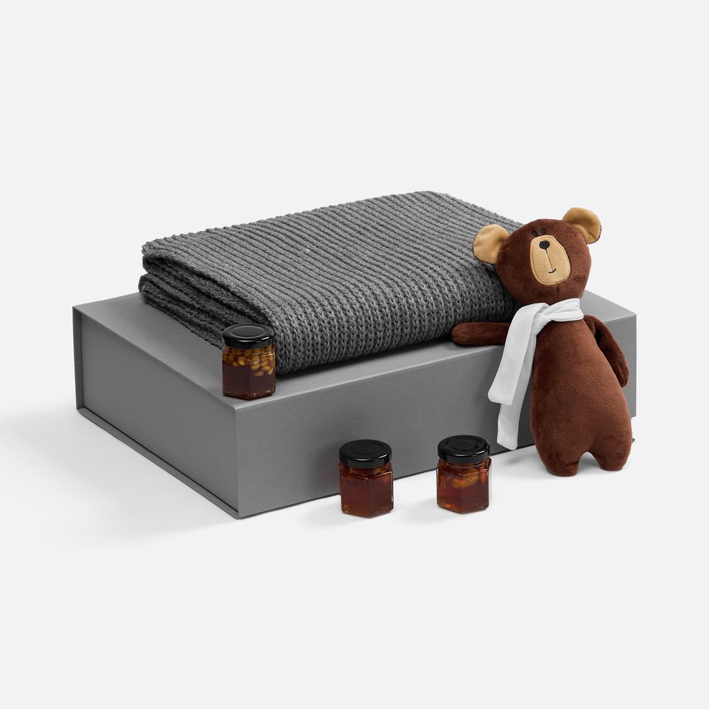 Милый мишка в шарфике с целой коллекцией разнообразного ароматного меда идеально дополняет основной, более практичный подарок — объемный шарф из толстой пряжи, который впишется в любой зимний образ. -