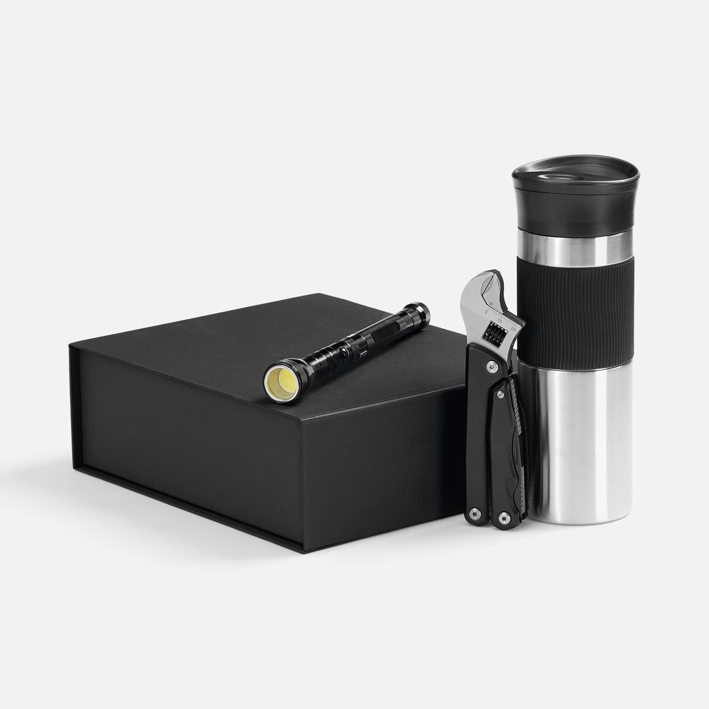 Компактный мультитул, гибкий фонарь и большой герметичный термостакан — все, что нужно для ремонта, строительства или работы в гараже. Емкость термостакана 450 мл. -