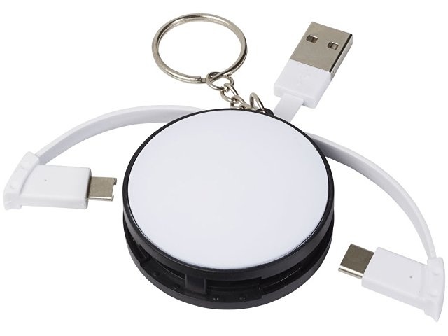 Зарядный кабель 3-в-1. Зарядный кабель 3-в-1 состоит из USB-шнура типа A, высокоскоростного шнура типа C и коннектора, который подходит для устройств iOS и Android. Для хранения кабель можно обернуть вокруг устройства. Поставляется с цепочкой для удобного ношения. Устройства на базе iOS заряжаются стороной без штырьков, устройства на базе Android — стороной со штырьками. ABS пластик.