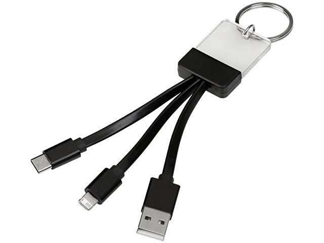 Кабель для зарядки Dazzle «3-в-1». Кабель для зарядки Dazzle «3-в-1» с разъемом USB A, разъемом USB Type C и двойным совместимым разъемом «2-в-1» для устройств Apple® iOS и Android. Он светится во время зарядки и поставляется с брелоком для удобной переноски. АБС-пластик.