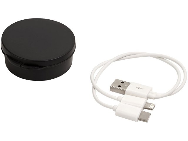 Кабель для зарядки Versa «3-в-1» в футляре. Кабель для зарядки Versa «3-в-1» в круглом футляре с кабелем USB с несколькими коннекторами, включая USB Type C и двойной совместимый коннектор «2-в-1» для устройств Apple® iOS и Android. АБС-пластик.