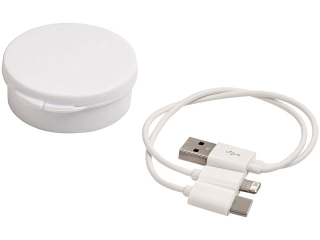 Кабель для зарядки Versa «3-в-1» в футляре. Кабель для зарядки Versa «3-в-1» в круглом футляре с кабелем USB с несколькими коннекторами, включая USB Type C и двойной совместимый коннектор «2-в-1» для устройств Apple® iOS и Android. АБС-пластик.