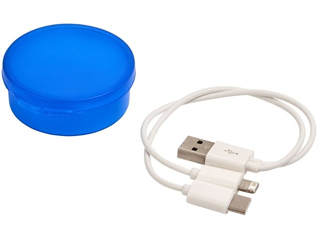 Кабель для зарядки Versa «3-в-1» в футляре. Кабель для зарядки Versa «3-в-1» в круглом футляре с кабелем USB с несколькими коннекторами, включая USB Type C и двойной совместимый коннектор «2-в-1» для устройств Apple® iOS и Android. АБС-пластик.