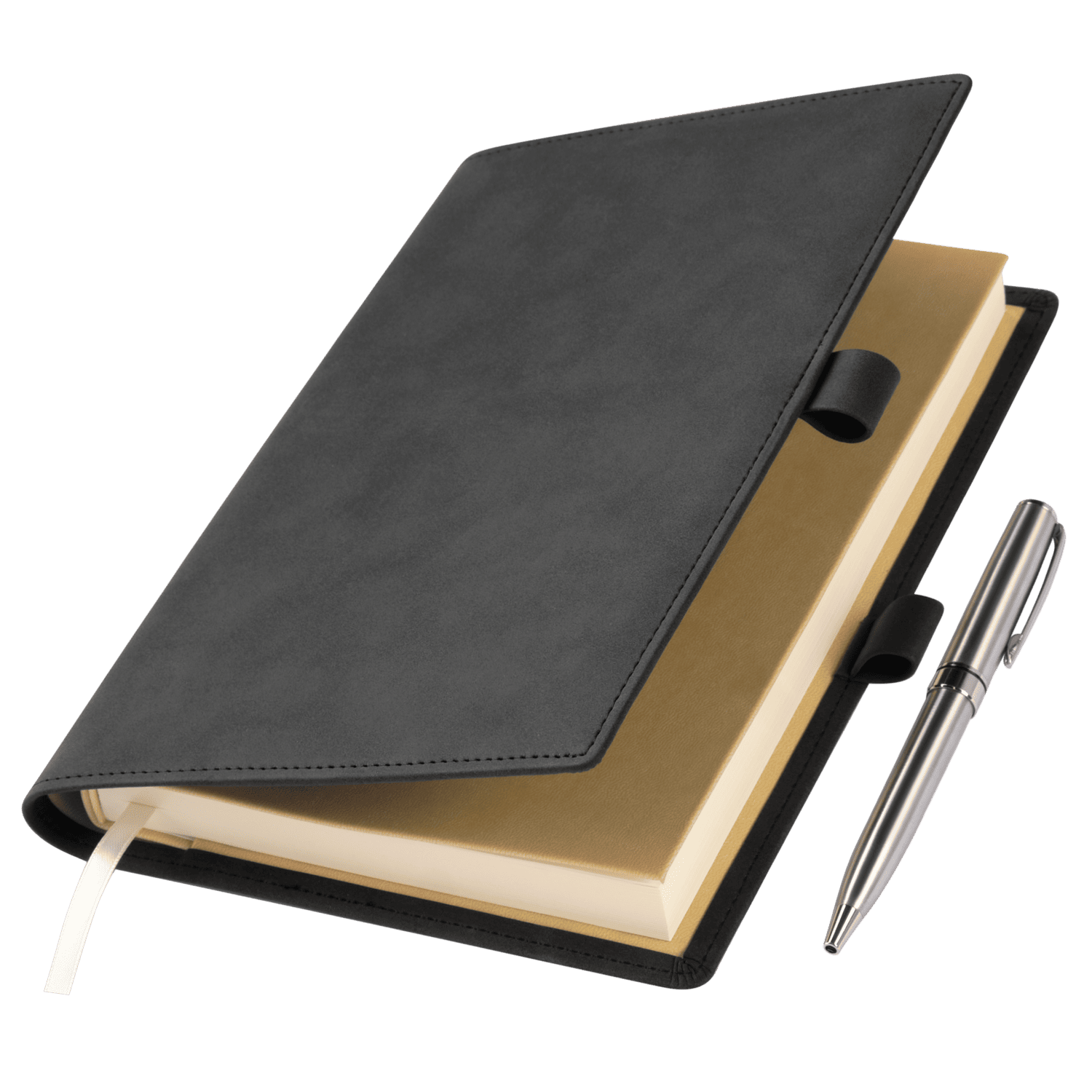 Застежка составлена из двух петель для ручки из материала и цвета обложки, расположенных на ее противоположных сторонах.