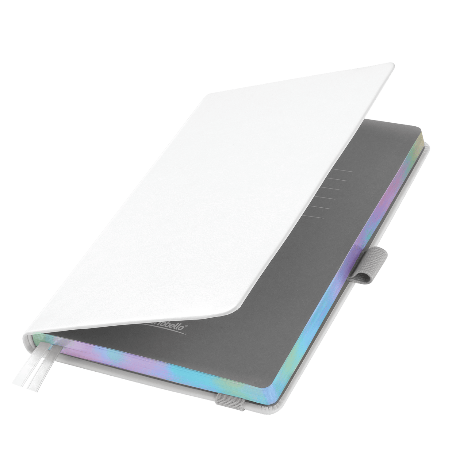 Недатированный ежедневник в жесткой обложке из качественной искусственной кожи. Материал обложки гладкий, текстурированный, с полуглянцевым блеском. Скругленные углы обложки и внутреннего блока. Отличительная особенность коллекции — голографический фольгированный срез блока. Форзац/нахзац– серые. Вариант в жесткой обложке украшен широкой вертикальной резинкой-фиксатором с вставкой из ПУ-материала обложки и петелькой под ручку, а также двойным ляссе (серым и в тон обложки).