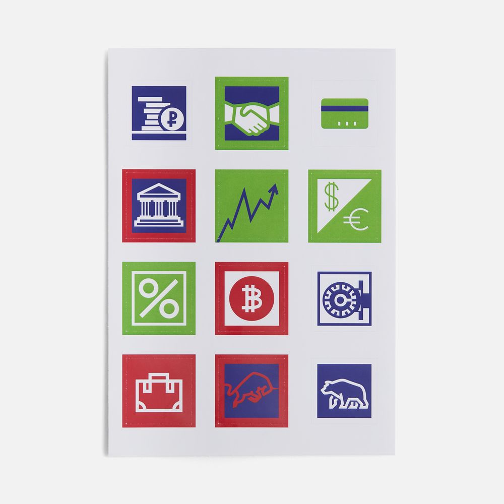В каждой части общего рисунка изображены главные символы, связанные с финансами. -