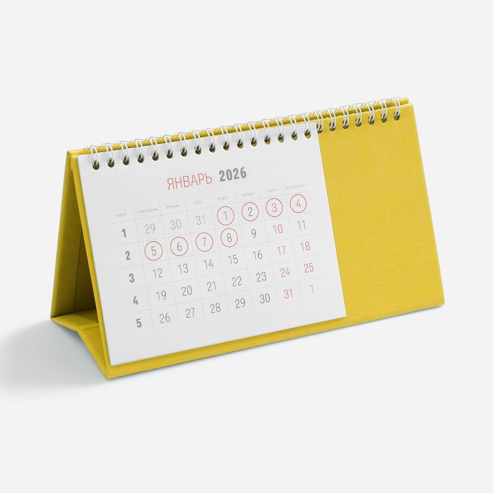 Настольный, перекидной календарь-домик выполнен из материала Latte, желтый KK. -