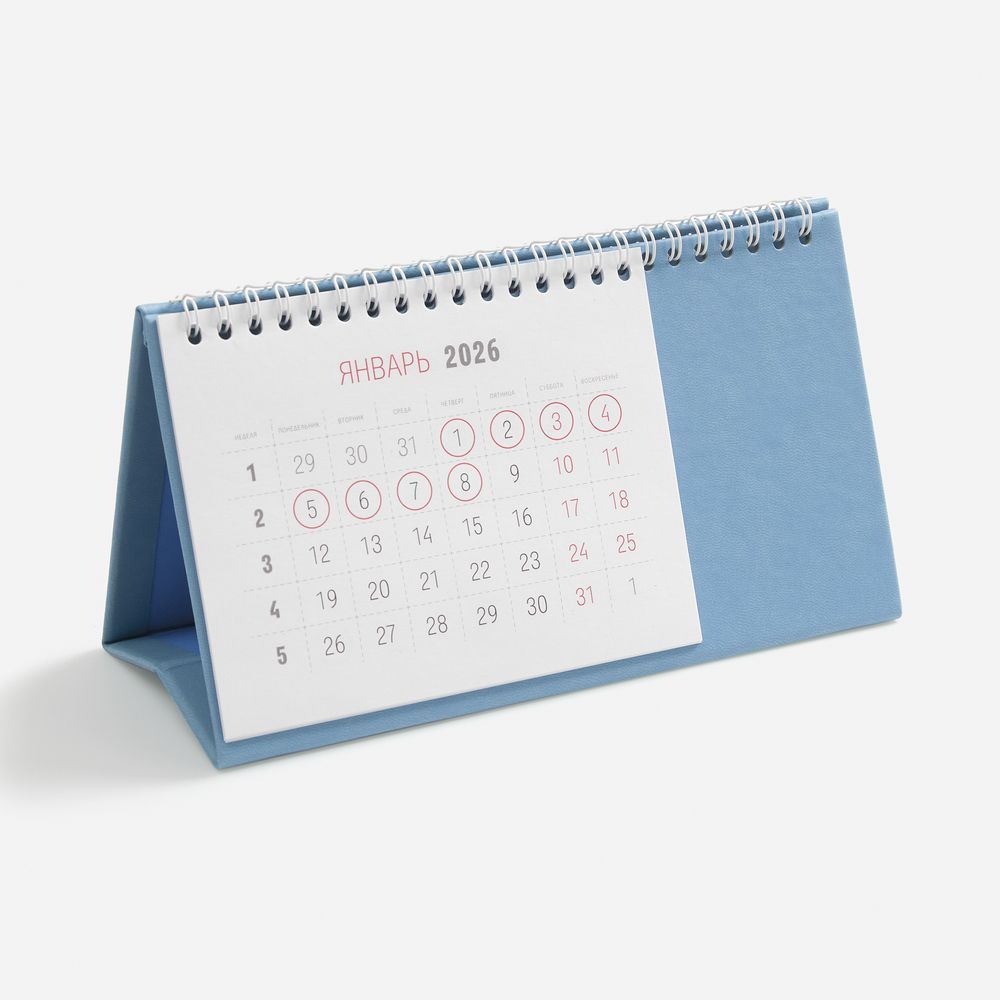 Настольный, перекидной календарь-домик выполнен из материала Latte, голубой JJ. -