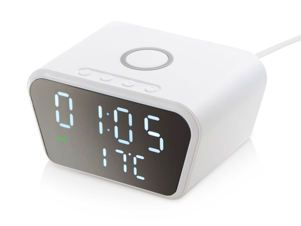 Настольные часы с функцией беспроводной зарядки позволят не только вовремя проснуться, но и восполнить за ночь уровень батареи вашего смартфона. Зеркальный LED-дисплей часов интересно выглядит в интерьере, а степень яркости можно изменить под себя. - будильник - отображает температуру в помещении - несколько режимов отображения данных - лаконичный дизайн часов уместно будет выглядеть в любом интерьере - регулировка степени яркости экрана Тампопечать (1 цвет (белые изделия)) на данный товар осуществляется бесплатно. Оплачивается только настройка оборудования в размере 4500 рублей на весь тираж.