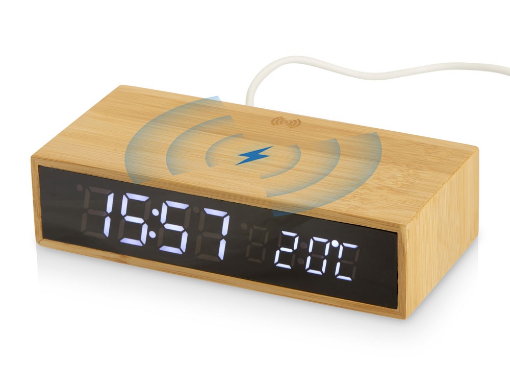 Настольные часы с корпусом из бамбука, имеют функцию беспроводной зарядки для смартфонов (10 Вт). Яркий дисплей. Функция измерения температуры окружающей среды. • беспроводная зарядка 10 Вт • широкий диапазон показываемых данных: дата, время, температура • будильник • яркий дисплей