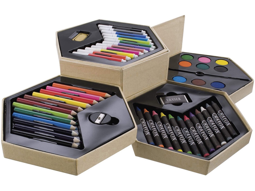 Набор из 52 предметов для рисования. 12 маркеров, 12 цветных карандашей, 12 восковых карандашей, 12 акварельных красок, кисточка, точилка, резинка и большая скрепка. Нанесение не делается на отдельные элементы набора. Картон. Тампопечать (1 цвет (цветные изделия)) на данный товар осуществляется бесплатно. Оплачивается только настройка оборудования в размере 4500 рублей на весь тираж.