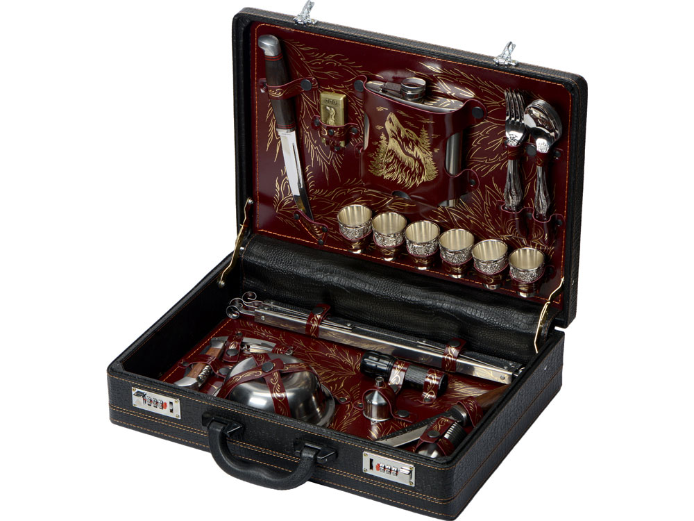 Кейс из сплит-кожи, с повышенной износостойкостью, внутренняя отделка натуральная кожа с художественным выжиганием. В комплект входит: Нож складной 13,5 х 4 х 1,6 см - 1шт Штопор 11 х 3 х 1 см - 1шт Тарелка d16 х 4 см - 6шт Воронка d4 х 4,8 - 1шт Нож Басмач 28 х 3 х 2,5 см -1 шт Стопка d5,2 х 6 см - 6шт Нож Кореш 26 х 4 х 2,5 см - 1шт Зажигалка 4 х 1,3 х 6 см - 1шт Стопка с узором d4,5 х 5 см - 6шт Фляга 13 х 3 х 15 см - 1шт Ложка 19,5 х 4,5 х 3 см - 6шт Вилка 19 х 2,5 х 2 см - 6шт Фонарик d3 х 9,5 см - 1шт УФ-печать (УФ-печать цветные изделия) на данный товар осуществляется бесплатно. Оплачивается только настройка оборудования в размере 2700 рублей на весь тираж.