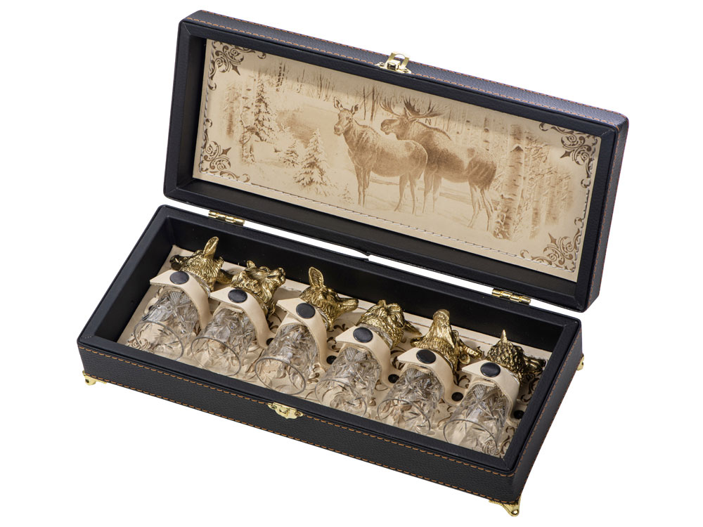 Футляр из эко-кожи, внутренняя отделка натуральная кожа молочного цвета. Рисунок нанесен путем термообработки. В набор входит шесть стопок по 50 мл. Хрусталь, литьё. УФ-печать (УФ-печать цветные изделия) на данный товар осуществляется бесплатно. Оплачивается только настройка оборудования в размере 2700 рублей на весь тираж.