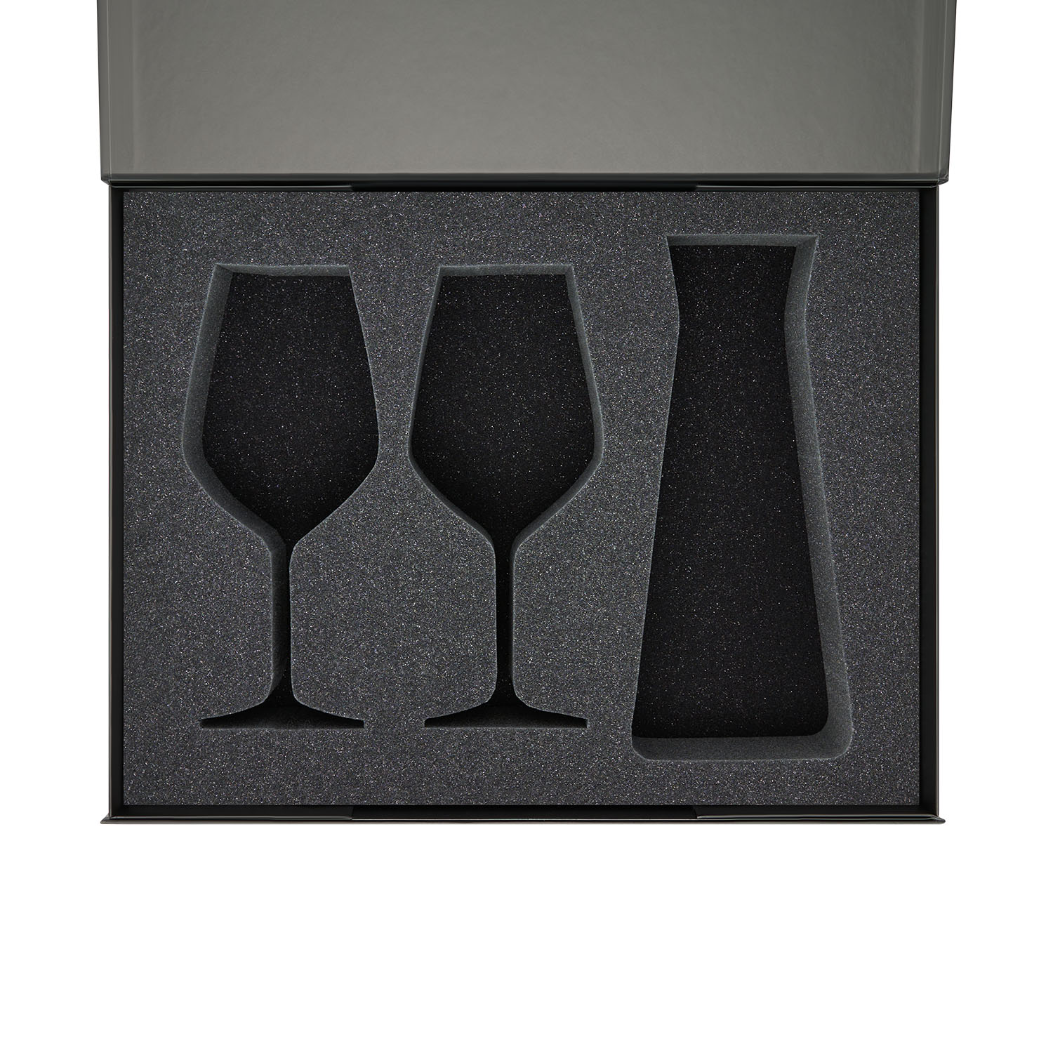 Идеальное решение для надежной и стильной упаковки двух бокалов и декантера для вина.