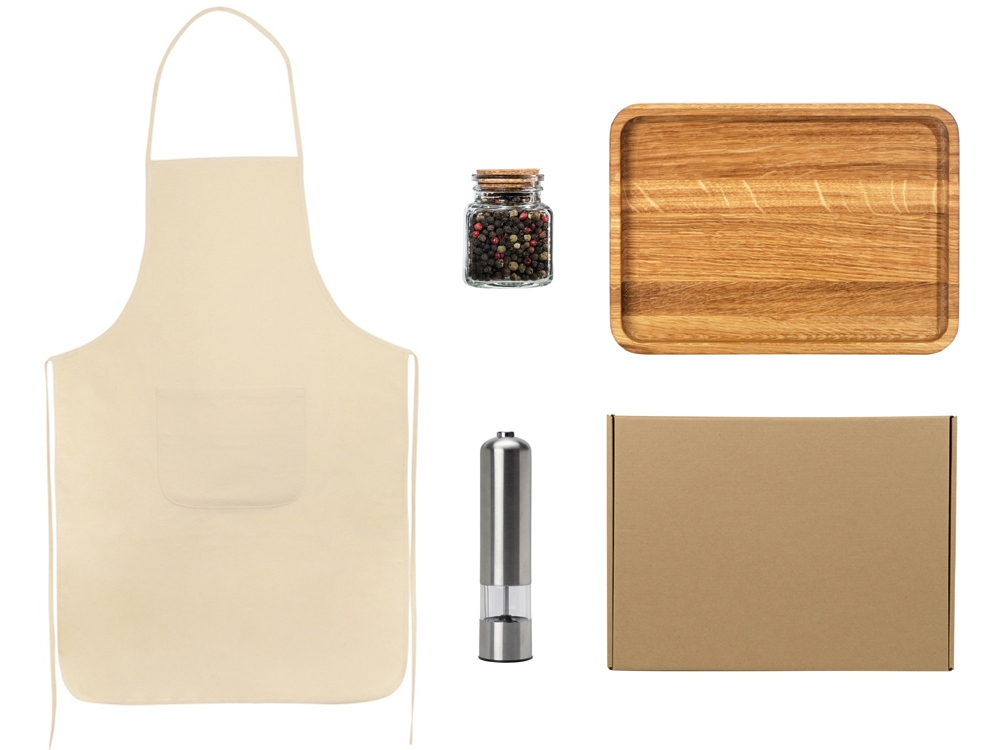 Набор для кухни — это отличный подарок для любого человека, который любит готовить и ценит уют на своей кухне. Классический фартук в нейтральном цвете регулируется на талии тонкими плотными завязками. Выполнен из 100% неокрашенного хлопка, поэтому в нем комфортно и не жарко находиться за плитой. Электрическая мельница подходит для измельчения крупной соли, перца и других специй. Для этого достаточно просто нажать на кнопку на корпусе устройства. Удобная регулировка степени помола от грубого до мелкого с помощью винтового механизма под ёмкостью в нижней части мельницы. Работает от 4-х батареек типа АА (в комплект не входят). Универсальный деревянный поднос выполнен из натурального дуба, обработанного натуральным растительным маслом, которое обеспечивает изделию более долгую жизнь. Подходит не только для сервировки стола и приготовления пищи, но и для организации хранения. Для поддержания внешнего вида и профилактики трещин рекомендуется регулярно протирать поднос льняным или вазелиновым маслом — так древесина дуба дольше будет сохранять свежий внешний вид и яркость. Свежемолотая смесь перцев подойдёт для мяса, стейков, рыбы, овощей, грибов, салатов и соусов. В виде целых горошин перец добавляют в маринады для овощей. Состав: перец черный, белый, зеленый, розовый. - мельница оснащена LED подсветкой для точного контроля количества специй; - керамические жернова мельницы не подвержены корозии; - размер подноса 25х18 см; - подарочная коробка уже входит в набор; - набор подойдёт в качестве подарка не только женщинам, но и мужчинам. Не рекомендуется использовать поднос в посудомоечной машине, микроволновой печи, замачивать в раковине с водой. Трафаретная печать (1 цвет (цветные изделия)) на данный товар осуществляется бесплатно. Оплачивается только настройка оборудования в размере 10000 рублей на весь тираж.
