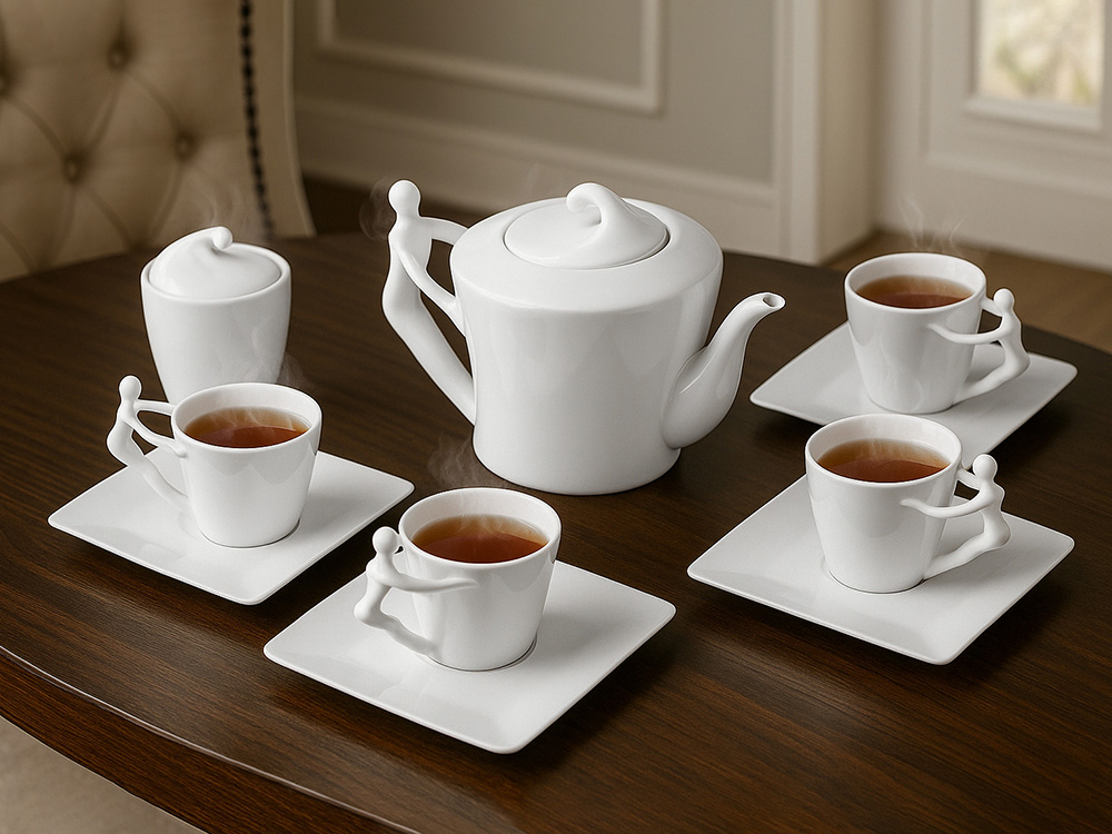 Это не просто посуда, а настоящее произведение искусства для вашего стола. Белоснежный сервиз создан для тех, кто ценит не только вкус, но и эстетику каждого момента. Уникальный дизайн: Ручки чашек и чайника выполнены в виде стилизованной фигуры человека. Это придает сервизу особый характер и глубину, превращая процесс чаепития в диалог с искусством. Полный комплект: В набор входит все необходимое: 4 чашки, 4 блюдца, чайник и сахарница. Эксклюзивная упаковка: Сервиз поставляется в деревянной коробке. Вы можете нанести на нее логотип или памятную надпись. Это готовая идея для безупречного корпоративного подарка. Универсальность и стиль: Белоснежный цвет и лаконичный дизайн делают сервиз уместным в любом интерьере — от классики до модерна. Гравировка (CO2 лазер) (Без чернения) на данный товар осуществляется бесплатно. Оплачивается только настройка оборудования в размере 2700 рублей на весь тираж.