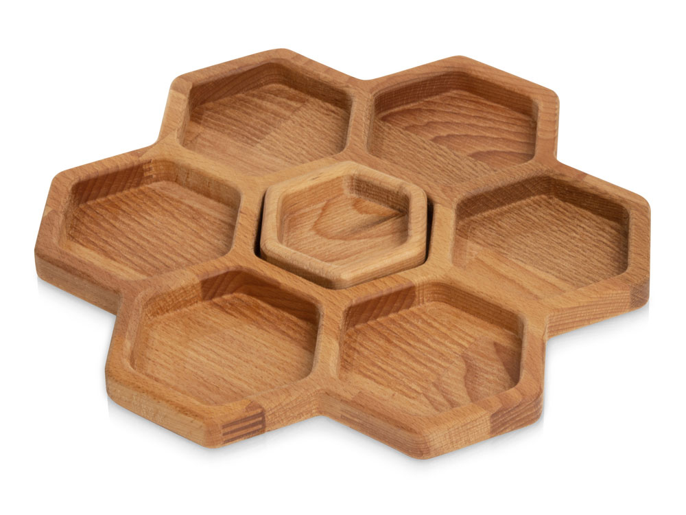 Менажница выполнена в виде семи сот для разных видов закусок — за бонусную дополнительную отвечает съемная сота-соусница, в которую можно залить мед или любимый соус. Менажница выполнена из бука и пропитана маслом, что обеспечивает изделию свежий вид. Советуем регулярно смазывать дерево пищевым маслом, чтобы изделие дольше радовало вас. - натуральный бук - съемная соусница - интересный дизайн - вариант для подачи 8 видов закусок - можно использовать для сервировки закусок Гравировка (CO2 лазер) (Без чернения) на данный товар осуществляется бесплатно. Оплачивается только настройка оборудования в размере 1100 рублей на весь тираж.