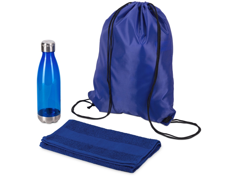 Универсальный спортивный набор будет актуален в любом виде спорта. Бутылка для воды позволит брать с собой не только воду, но и тонизирующие напитки или коктейли и поможет освежиться в любой момент. Тритан, из которого изготовлена бутылка, не искажает вкус и запах напитков, являясь абсолютно безопасным для человека. Натуральное полотенце из 100% хлопка не вызовет аллергии и не навредит коже. Вместительный рюкзак пригодится, чтобы всегда держать под рукой всё необходимое для тренировки. • объём бутылки: 700 мл • размер полотенца: 30х70 см • практичный набор для спортивного мерча Трафаретная печать (1 цвет (цветные изделия)) на данный товар осуществляется бесплатно. Оплачивается только настройка оборудования в размере 10000 рублей на весь тираж.
