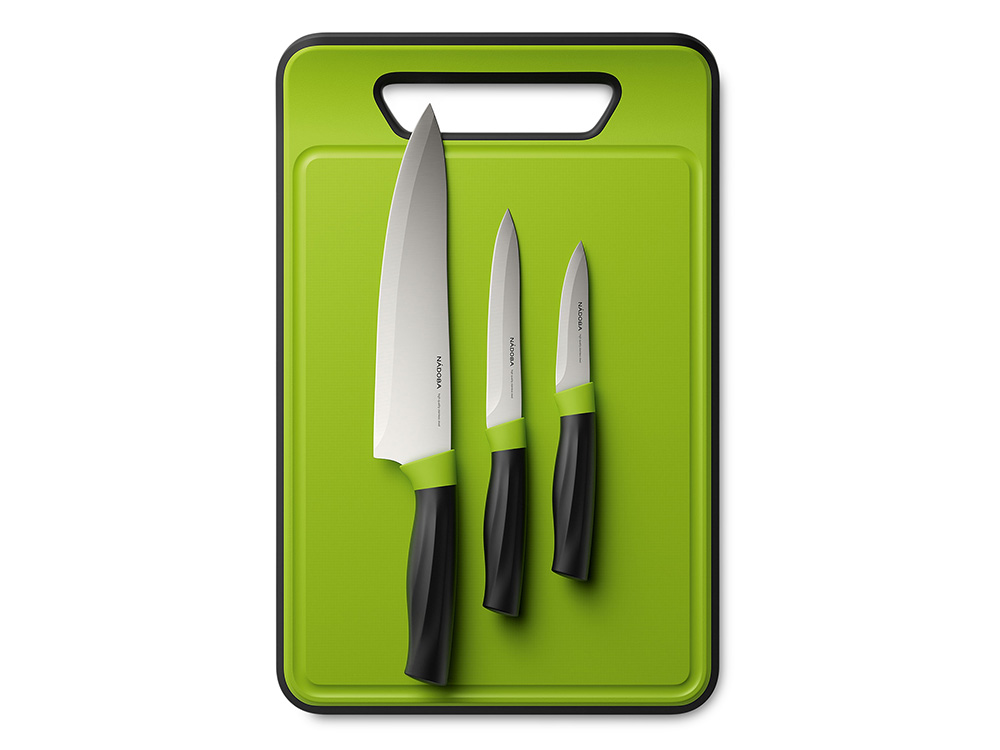 Набор из 3 ножей с доской NADOBA серии Olivia состоит из: нож овощной, 9 см, нож универсальный, 12,5 см, нож поварской, 20 см и разделочной доски 37,5х25х0,8 см. Ножи выполнены из высококачественной нержавеющей стали с высоким содержанием углерода. Благодаря этому нож обладает высокой твердостью 52-54 HRC по шкале Роквелла и превосходными антикоррозийными свойствами. За счет пятигранного профиля и правильной толщины лезвий ножи обладают идеальным балансом и длительное время не требуют заточки. Разделочная доска с оптимальной толщиной 8 мм из пищевого пластика высокоустойчива к истиранию и износу, не впитывает запахи и легко моется. Углубление, которое располагается по периметру разделочной доски, удерживает жидкость от продуктов и сохраняет стол в чистоте. Изделия можно мыть в посудомоечной машине. Гарантия на набор Olivia 3 года.