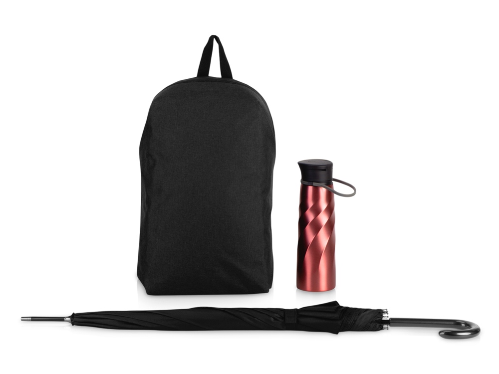 Must-have для жизни в городе: рюкзак, зонт и бутылка для воды. Вместительный рюкзак из полиэстера позволит аккуратно перевозить компьютер, планшет или любой другой гаджет, с помощью лямки их можно надежно зафиксировать внутри рюкзака. Классический зонт-трость имеет купол из эпонжа плотностью 190T. Металлическая ось дополнена прочными и легкими спицами из файбергласса. Бутылка для воды сочетает в себе превосходную функциональность и внешний вид. Высококачественная сталь 18/8 и одностенная конструкция делает бутылку не только прочной, но и лёгкой. Крышка сконструирована таким образом, чтобы ее можно полностью разобрать для удобной чистки. - внутреннее отделение рюкзака для небольших предметов; - зонт с функцией анти-шторм; - объем бутылки 1000 мл. Внимание: При транспортировке бутылка находится внутри рюкзака, а зонт поставляется отдельно в транспортной упаковке. Термотрансфер (1 цвет (цветные изделия)) на данный товар осуществляется бесплатно. Оплачивается только настройка оборудования в размере 10000 рублей на весь тираж.