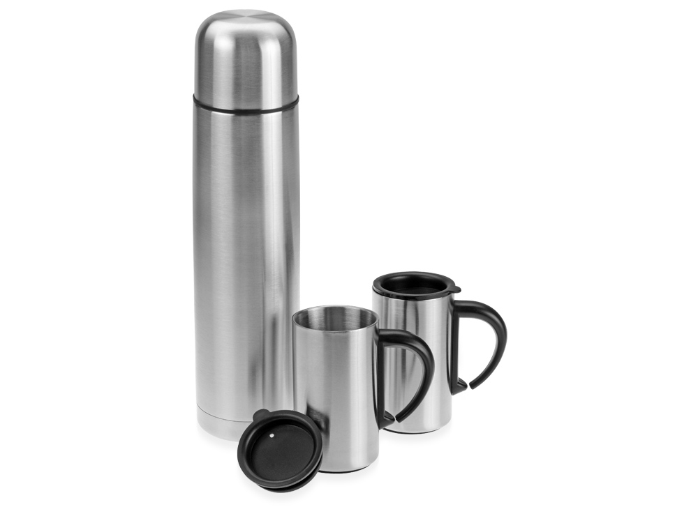 Отличный набор, состоящий из термоса на 1000 мл и двух термокружек на 300 мл, пригодится и в дороге, и во время пикника или похода. Нержавеющая сталь не впитывает запахи и отлично удерживает тепло более 24 часов. Термокружки идут со специальными пластиковыми крышками. Упакован в картонную коробку с мягким поролоновым ложементом. Гравировка (оптоволоконный лазер) (Без чернения) на данный товар осуществляется бесплатно. Оплачивается только настройка оборудования в размере 1100 рублей на весь тираж.