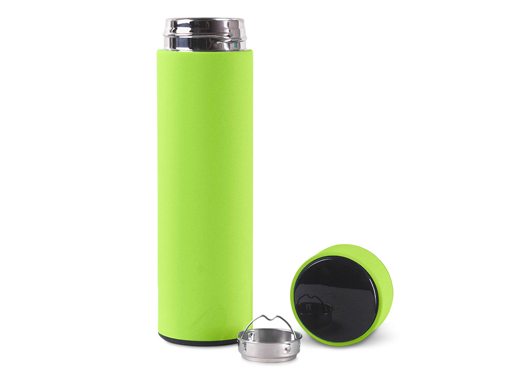 Термос из нержавеющей стали, покрытый цветным soft touch, с крышкой, в которой встроен термометр и LED дисплей, показывающий температуру внутри термоса. Объем: 500 мл. Упаковка: каждый термос в крафт коробке.