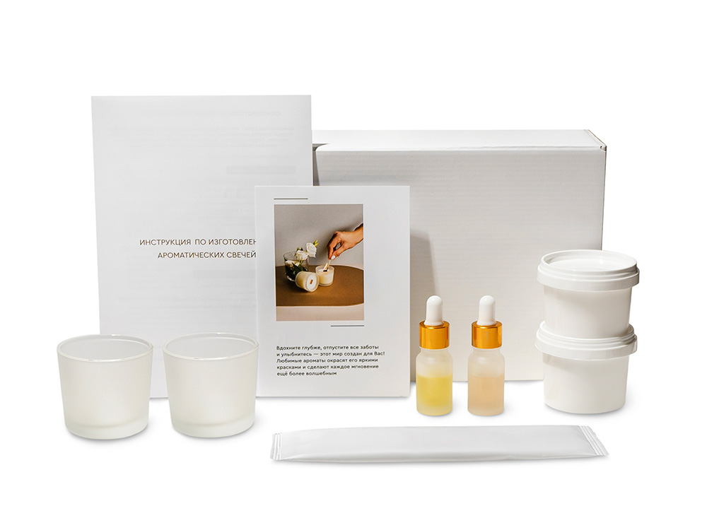 Уникальный набор для изготовления ароматических свечей станет приятным подарком и погрузит в увлекательный процесс. Набор выполнен в подарочной коробке с ложементом, в него входят все необходимые компоненты и подробная инструкция. Откройте для себя удивительный мир ароматов с Lights of Moscow! Вы сможете создать две невероятные композиции, которые точно понравятся Вам и Вашим близким! Условия хранения: — Свечи: +18…+24 °C, вдали от источников тепла, сквозняков и прямых солнечных лучей. — Рекомендуемая влажность — не более 50%. — Избегайте длительного воздействия яркого света. В комплекте: Подарочная коробка с ложементом - 1 шт. Стакан стеклянный матовый 100 мл - 2 шт. Контейнер с соевым воском – 2 шт. Флакон стеклянный матовый с ароматической отдушкой – 2 шт. Деревянный фитиль с держателем – 1 шт. Хлопковый фитиль с держателем - 1 шт. Наклейка для крепления фитиля - 2 шт. Палочка для перемешивания - 2 шт. Салфетка - 1 шт. Перчатка - 1 шт. Открытка - 1 шт. Инструкция по изготовлению ароматических свечей – 1 шт.