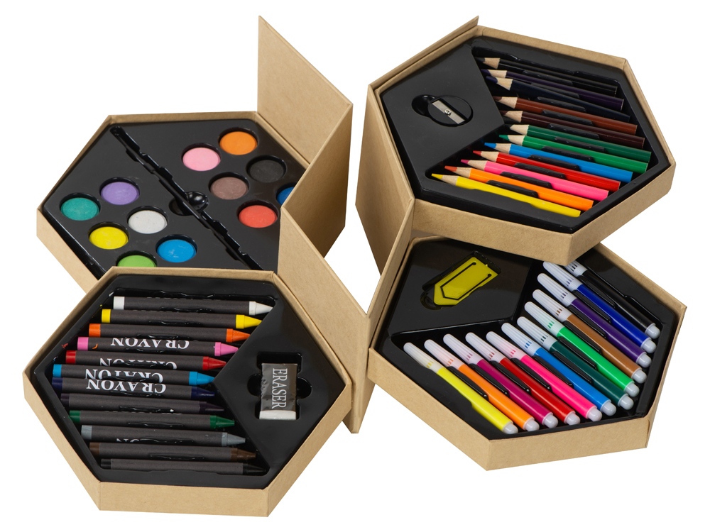 Набор из 52 предметов для рисования. 12 маркеров, 12 цветных карандашей, 12 восковых карандашей, 12 акварельных красок, кисточка, точилка, резинка и большая скрепка.