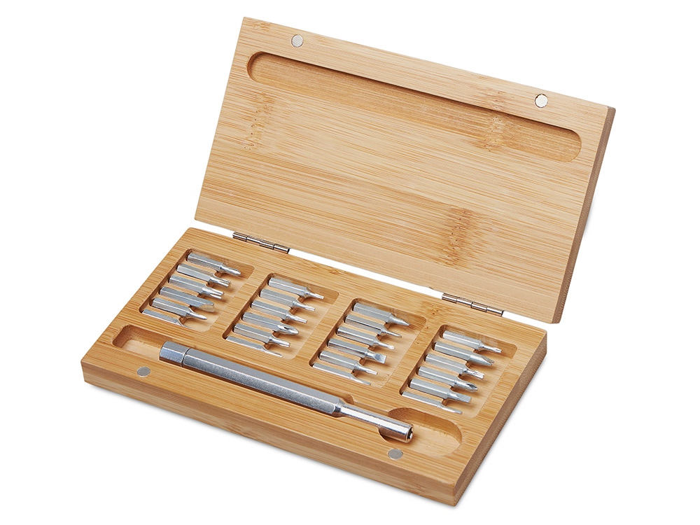Стильный и практичный набор отверток в элегантном корпусе из натурального бамбука. Компактный кейс закрывается на магниты, а верхняя крышка отмечена круглым красным стикером для удобной идентификации. Внутри — отвертка и 24 наиболее востребованные биты: крестовые, плоские и звездочки, которые подойдут для решения большинства бытовых и профессиональных задач. Набор выполнен из экологичных материалов — прочной стали и натурального бамбука. Классическая прямоугольная форма без выступающих деталей делает его особенно удобным для персонализации и нанесения логотипа. • 24 популярные биты в одном наборе • Экологичные материалы: натуральный бамбук и сталь • Магнитная фиксация крышки • Удобная прямоугольная форма под нанесение логотипа • Компактный и презентабельный дизайн Гравировка (CO2 лазер) (Без чернения) на данный товар осуществляется бесплатно. Оплачивается только настройка оборудования в размере 2700 рублей на весь тираж.