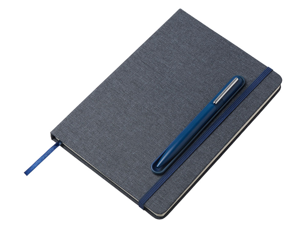 Блокнот в твердой обложке из rpet-пластика с металлической шариковой ручкой. В обложке магнитный держатель для ручки. Также верхняя часть обложки трансформируется в подставку для телефона. В блокноте 80 листов бумаги 70 г/м2. Термотрансфер (1 цвет (цветные изделия)) на данный товар осуществляется бесплатно. Оплачивается только настройка оборудования в размере 10000 рублей на весь тираж.