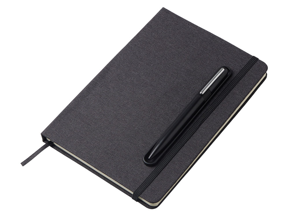 Блокнот в твердой обложке из rpet-пластика с металлической шариковой ручкой. В обложке магнитный держатель для ручки. Также верхняя часть обложки трансформируется в подставку для телефона. В блокноте 80 листов бумаги 70 г/м2. Термотрансфер (1 цвет (цветные изделия)) на данный товар осуществляется бесплатно. Оплачивается только настройка оборудования в размере 10000 рублей на весь тираж.