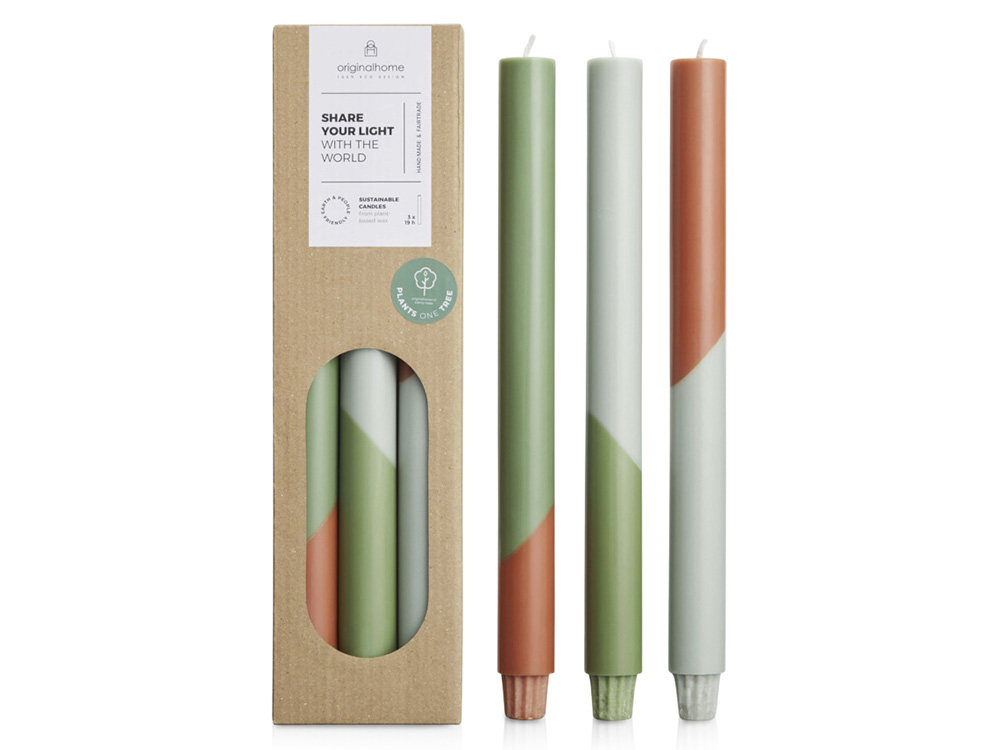 Свечи для ужина Eden отличаются яркой диагональной цветовой палитрой и изготовлены вручную из воска на растительной основе, не содержащего парафина. Они не имеют запаха, имеют фитиль из 100% хлопка и горят чисто. Каждая покупка способствует посадке дерева для фермеров в Африке и поддерживает специальный проект справедливой торговли на острове Ява, Индонезия. Комплект из трех штук. Время горения свечи: 18 – 20 часов. Воск из пальмовых ядер.